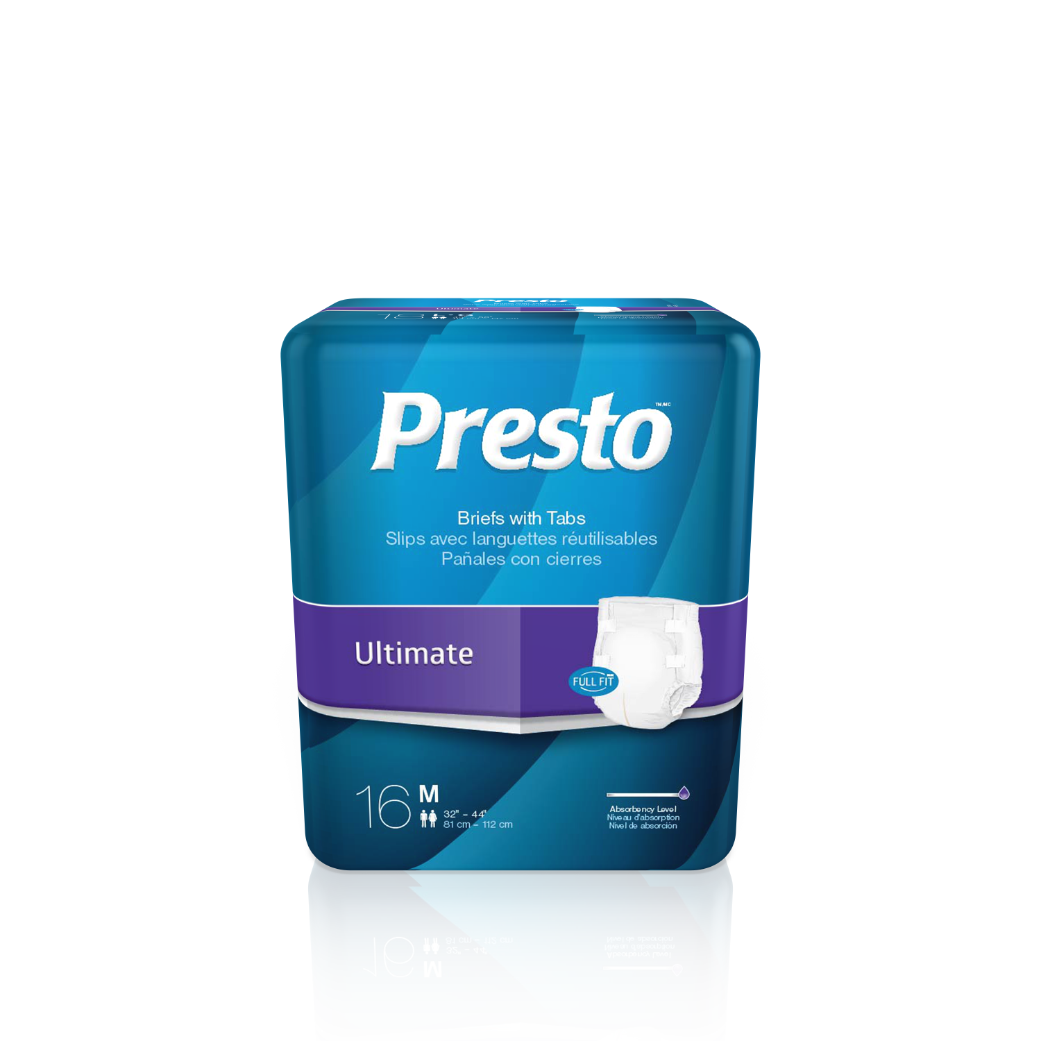 Presto Ultimate Brief, Maximum Absorbency, Medium, 32″-44″. Sold by the case. Each case includes 6 packages with 16 items.