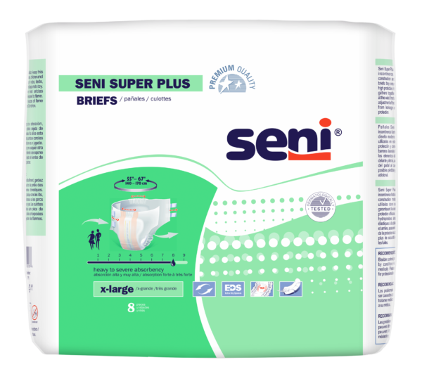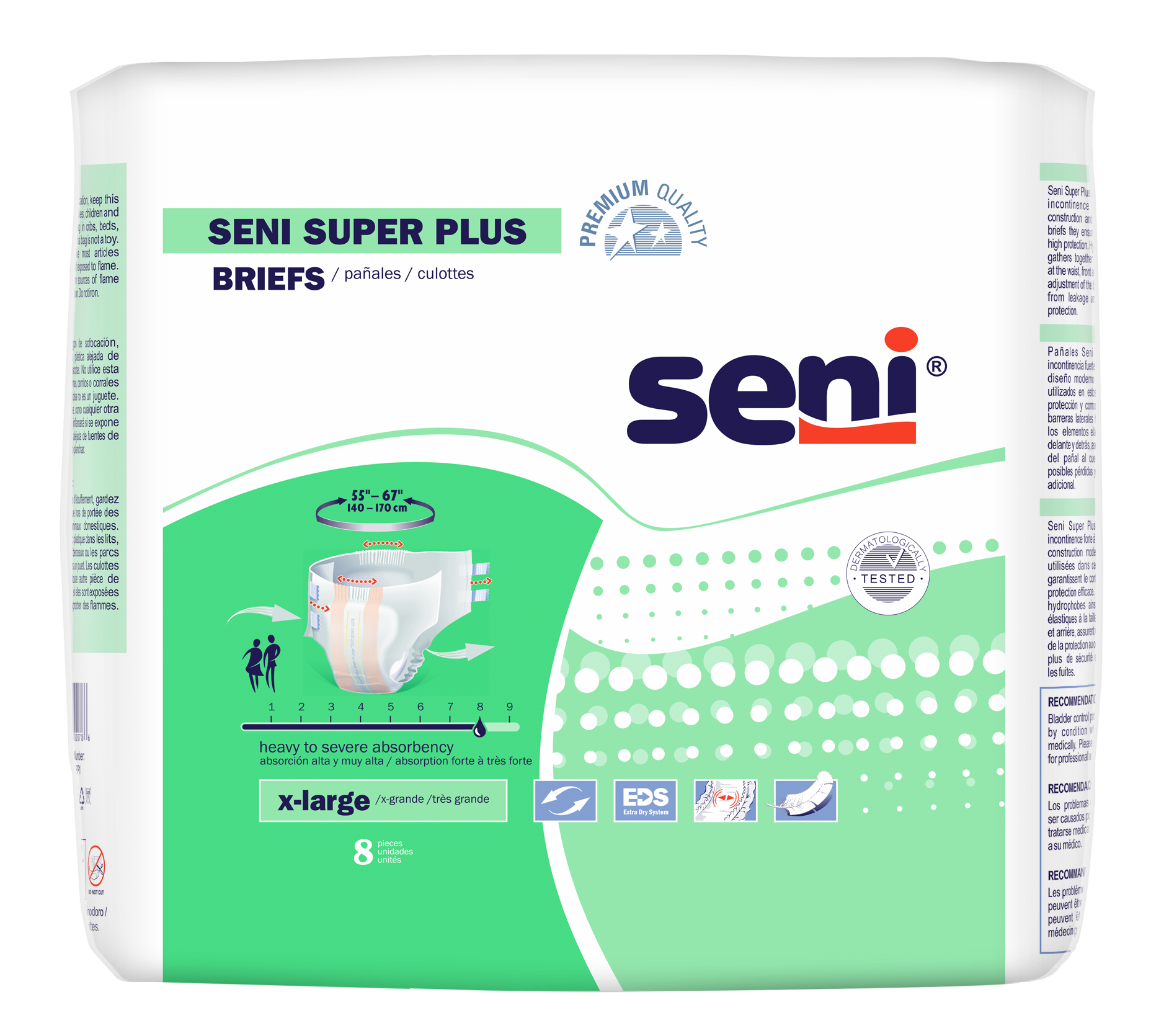SENI SUPER PLUS PREMIUM QUALITY BRIEFS are designed both for active people and those with limited mobility. They are ideal in cases of heavy to severe incontinence. Side gathers, leg cuffs and elastic elements in the waist, front, and rear help the product fits better and protect against leaks.; Fully breathable: vapor permeable outer layer helps the skin breathe easily.; hydrophobic standing side gathers and leg cuffs help prevent side leakages.; superabsorbent locks moisture into the core and minimizes urine odor.; soft non-woven extra dry system distributes wetness for faster absorption into the core and improves the feeling of dryness.; double absorbent core provides high absorbency. Elastic combi-tapes ensure a better adjustment of the briefs to the body and allows multiple refastening without tearing.; double wetness indicator lets caregiver know when changing is necessary.; not made with natural rubber latex.; waist /hip size EXTRA LARGE 55” – 67”.