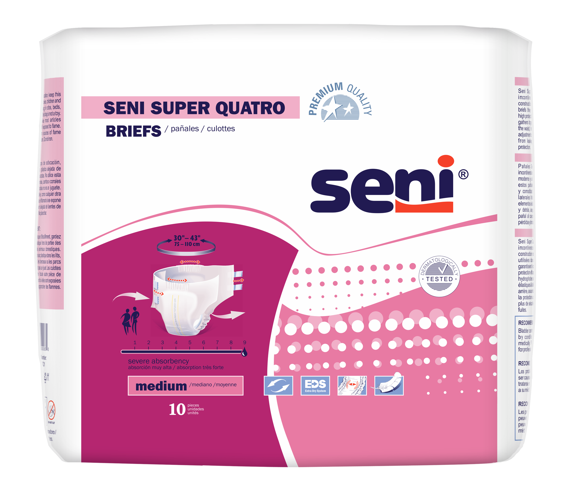 SENI SUPER QUATRO PREMIUM QUALITY BRIEFS are designed both for active people and those with limited mobility. They are ideal for severe incontinence or overnight use. Side gathers, leg cuffs and elastic elements in the waist, front, and rear help the product fits better and protect against leaks.; Fully breathable: vapor permeable outer layer helps the skin breathe easily.; hydrophobic standing side gathers and leg cuffs help prevent side leakages.; superabsorbent locks moisture into the core and minimizes urine odor.; soft non-woven extra dry system distributes wetness for faster absorption into the core and improves the feeling of dryness.; double absorbent core provides high absorbency. Elastic combi-tapes ensure a better adjustment of the briefs to the body and allows multiple refastening without tearing.; double wetness indicator lets caregiver know when changing is necessary.; not made with natural rubber latex.; waist /hip size MEDIUM 30” – 43”.
